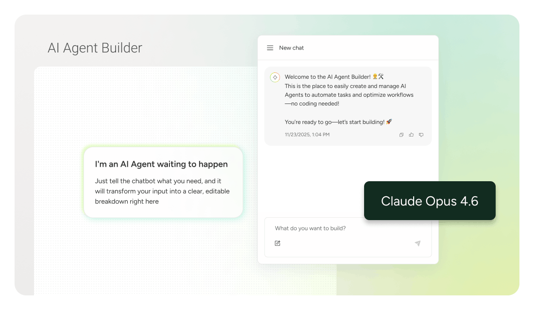 Claude Opus 4.6, Anthropic’s latest and smartest large language model, is now driving the code generation in AI Agent Builder. Build AI agents with greater accuracy, stronger logic, less rework, higher quality code, and an improved overall building experience