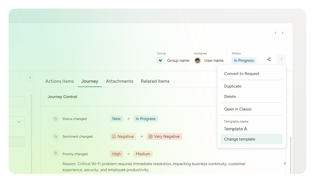 Easily update the ticket template directly from within the ticket – ensuring it has the correct fields and follows the workflow designed to move the ticket along to resolution.